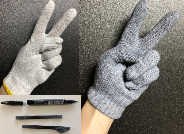 使い古し(つかいふるし)のペンのインクを使う(つかう)と、ペン一本(いっぽん)で、軍手(ぐんて)なら3組(さんくみ)くらい染め(そめ)られます。
