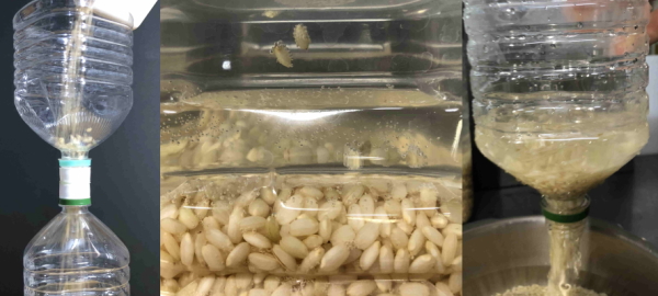 ペットボトルに玄米を入れて、水に1日浸し、鍋に入れたところですペットボトルどうしをつなぐキャップのところは、大人(おとな)の人に手伝っ(てつだっ)てもらって作っ(つくっ)てね。