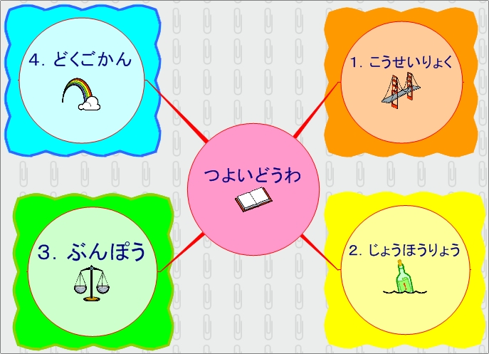 つよいこ方式では、『はじめ⇒なか⇒おわり』の三段階のそれぞれの役割を、学校の生活に例えて考えていきます。
