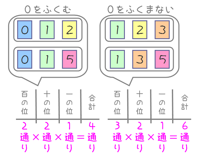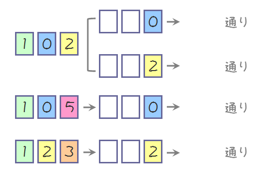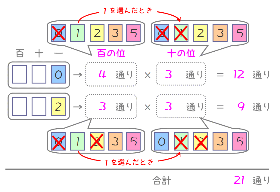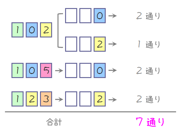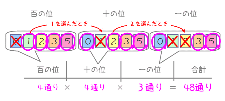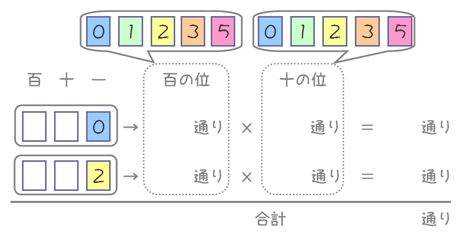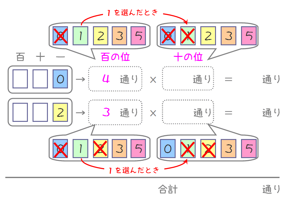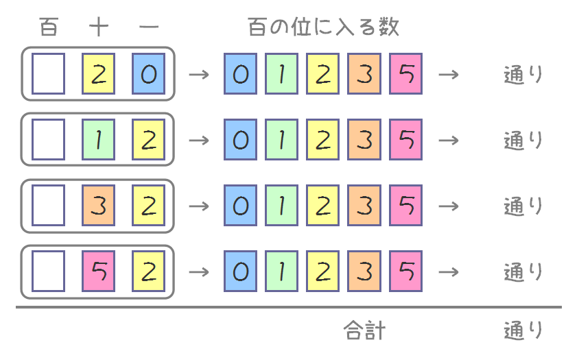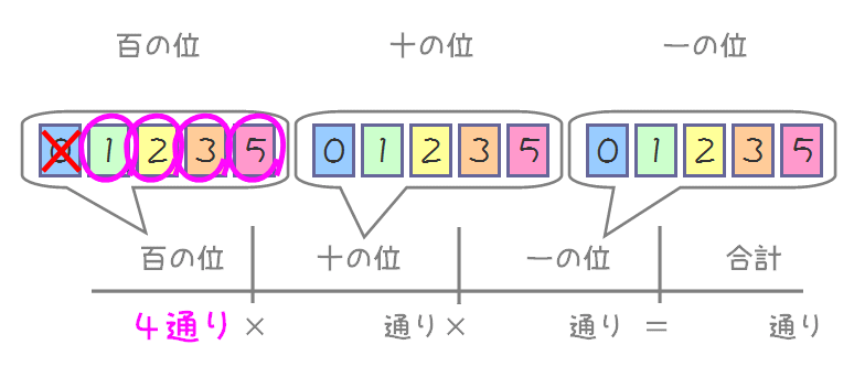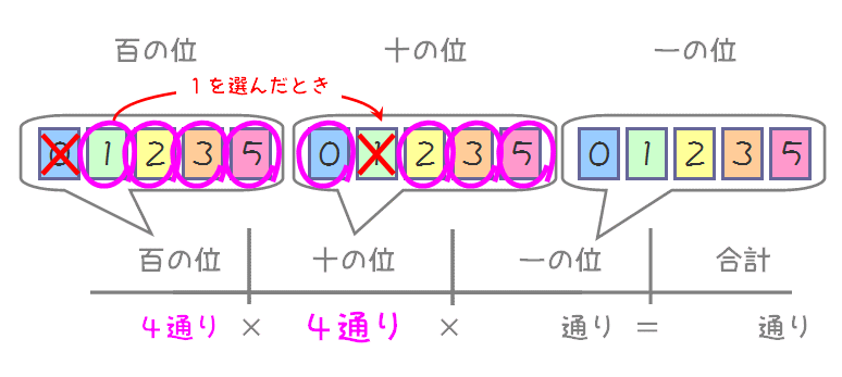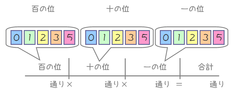 一の位はもうひとつ抜けるので、3通りです。全部かけると、