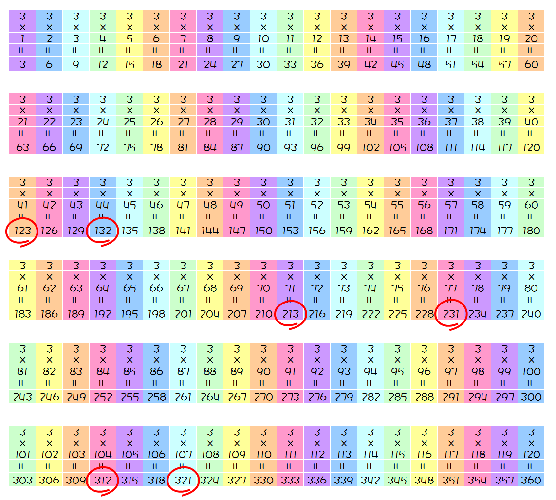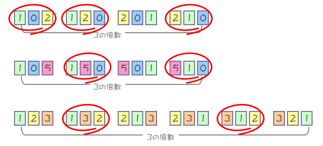 「1」「2」「3」のくみ合わせもぜーんぶ「1+2+3=6」だから、3の倍数だわ。