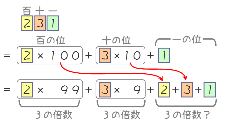 「2+3+1」の和が3の倍数なら、全体が3の倍数になります。