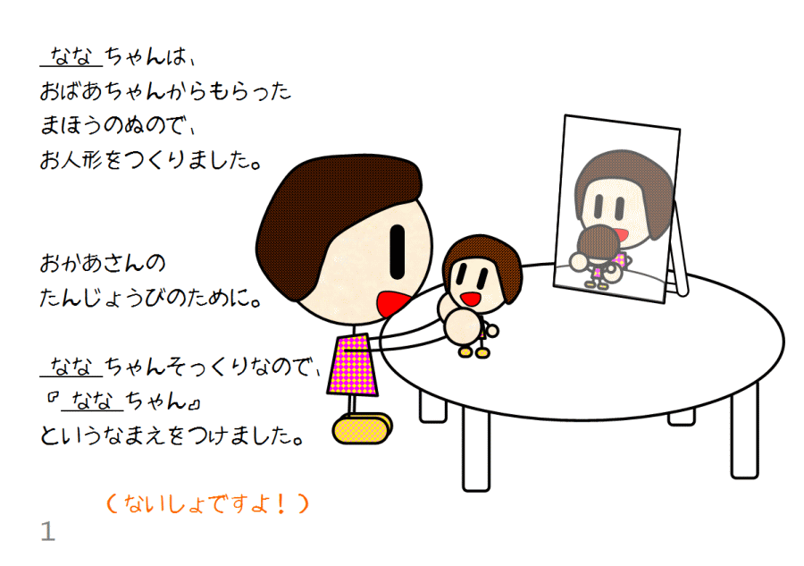 なな ちゃんは、おばあちゃんからもらった まほうのぬの で、お人形をつくりました。
