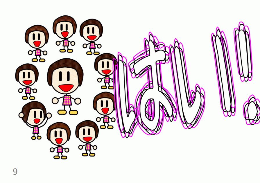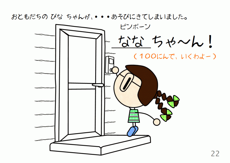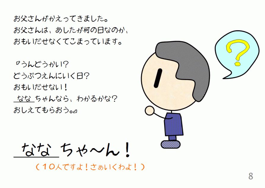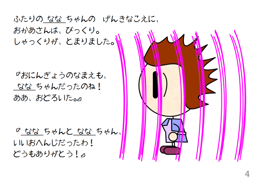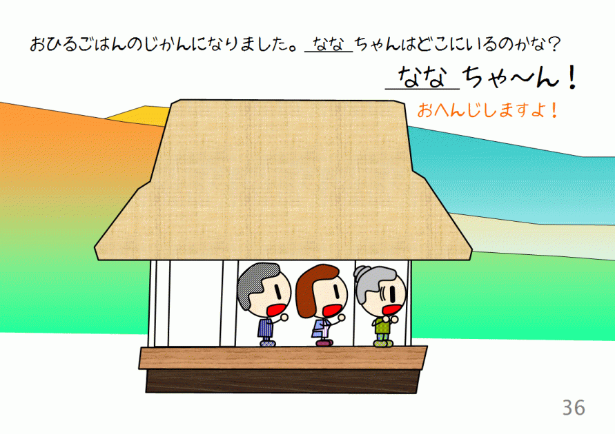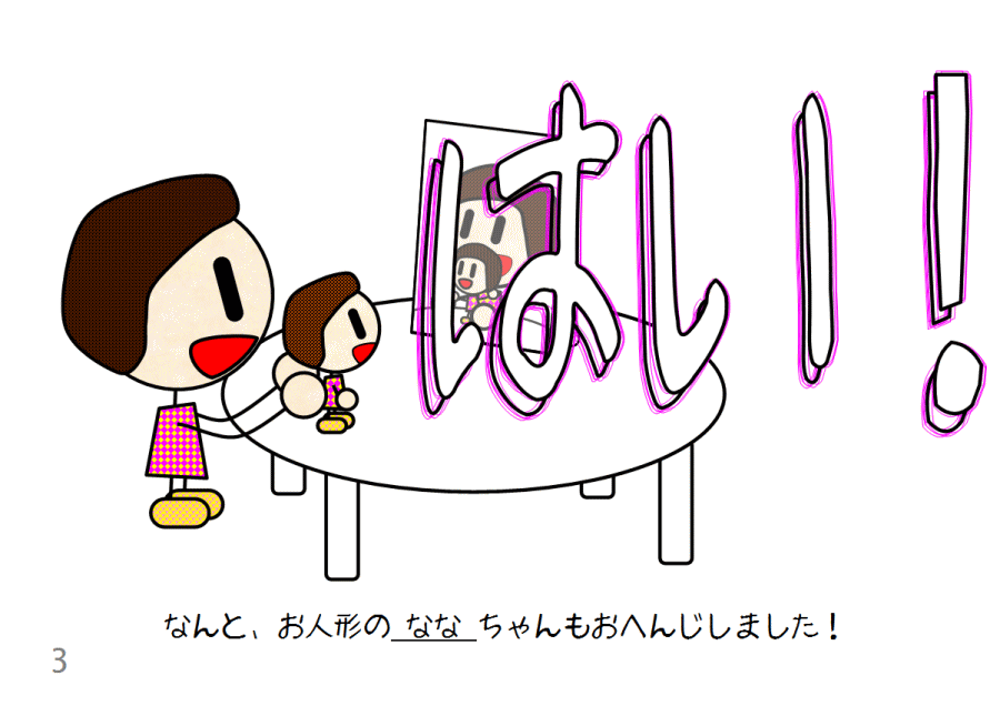 ななちゃんたちの「はい!」の返事のところで、お子さんに「ぼんっ!」っていう効果音を入れてもらうと、いっそう楽しくなります。