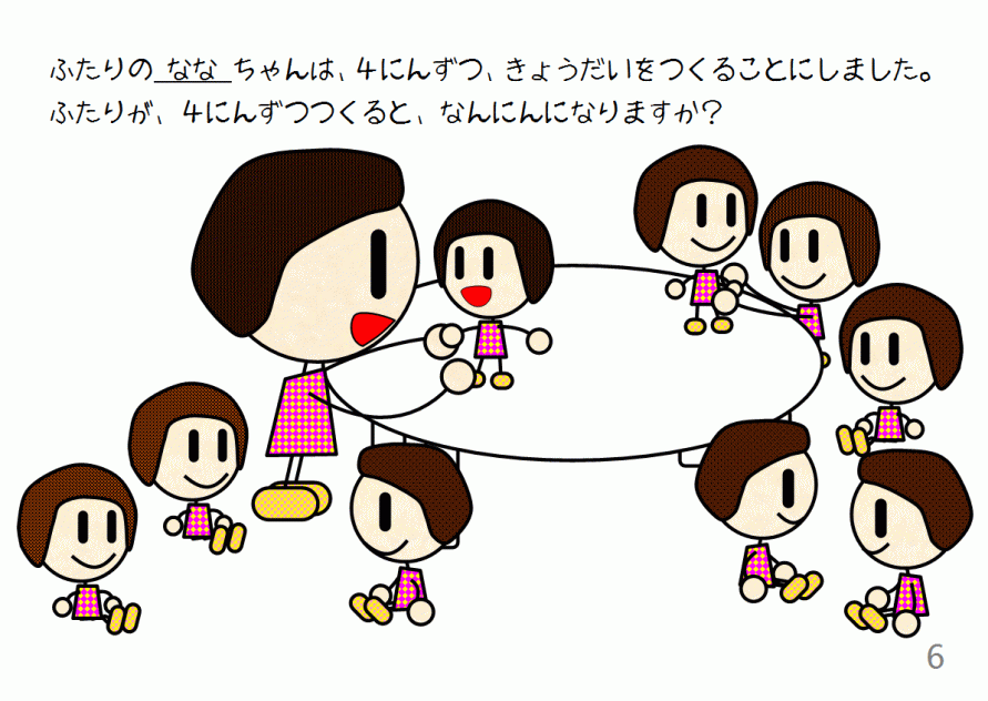 5ページふたりの なな ちゃんは、4にんずつ、きょうだいをつくることにしました。ふたりが、4にんずつつくると、なんにんになりますか?