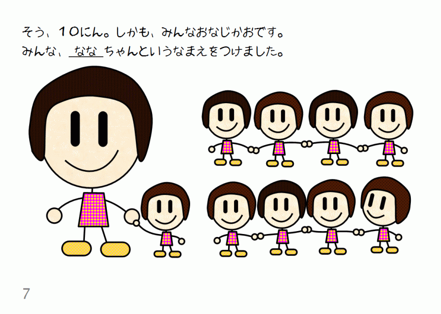 6ページそう、10にん。しかも、みんなおなじかおです。みんな、 なな ちゃんというなまえをつけました。