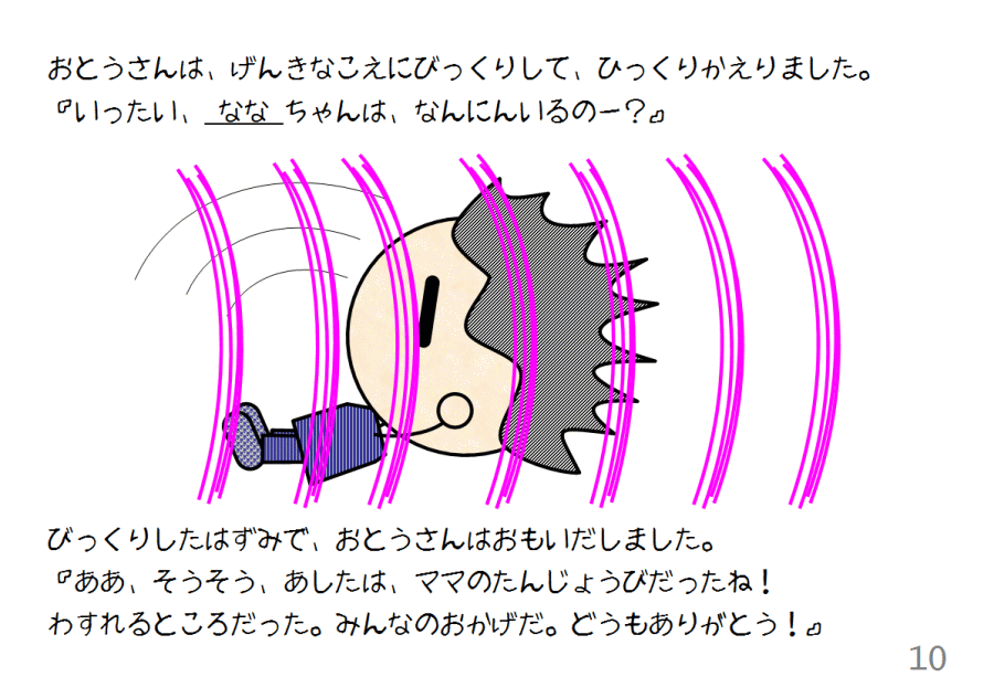 9ページおとうさんは、げんきなこえにびっくりして、ひっくりかえりました。