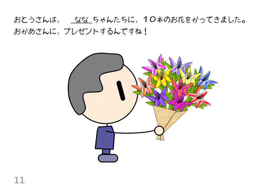 おとうさんは、 なな ちゃんたちに、10本のお花をかってきました。