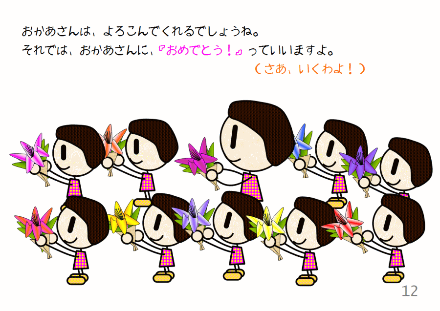 それでは、おかあさんに、『おめでとう!』っていいますよ。(さあ、いくわよ!)