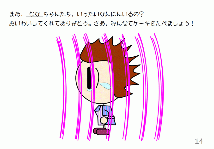 おいわいしてくれてありがとう。さあ、みんなでケーキをたべましょう!