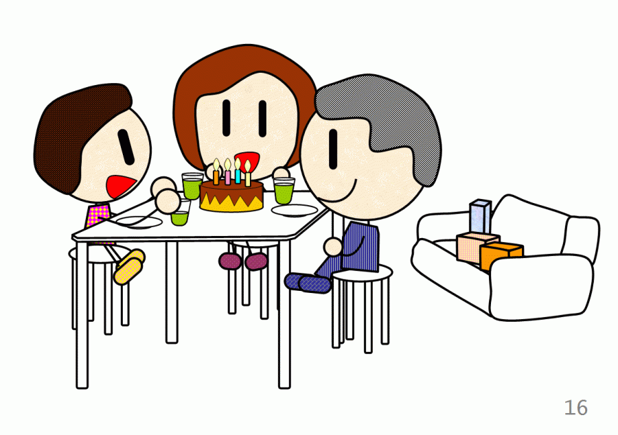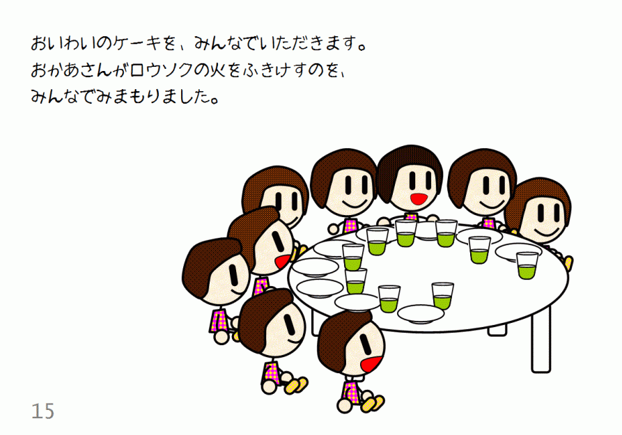 おかあさんがロウソクの火をふきけすのを、みんなでみまもりました。