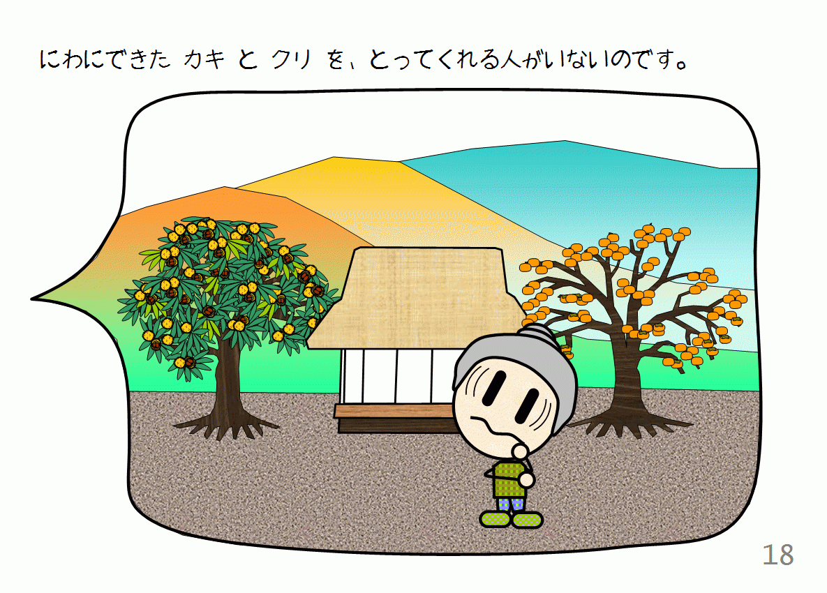 17ページにわにできた カキ と クリ を、とってくれる人がいないのです。