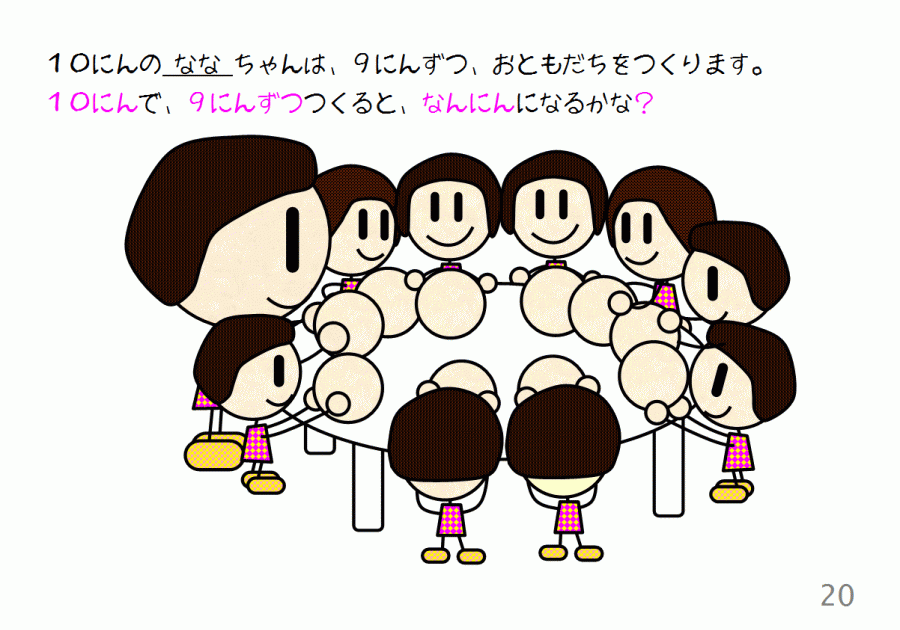 19ページ10にんの なな ちゃんは、9にんずつ、おともだちをつくります。