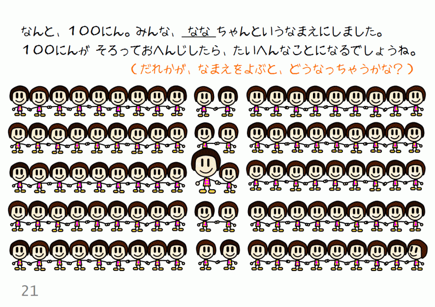 100にんが そろっておへんじしたら、たいへんなことになるでしょうね。(だれかが、なまえをよぶと、どうなっちゃうかな?)