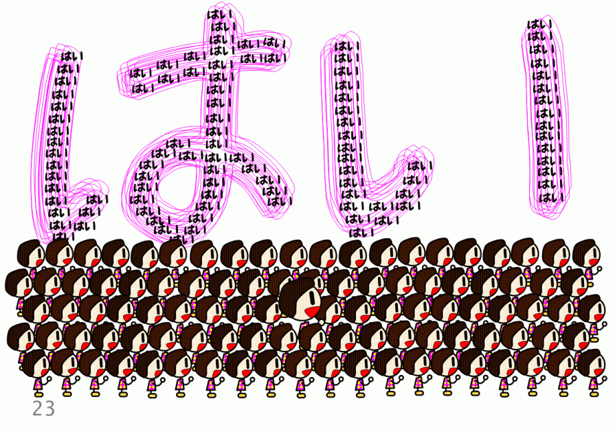 10人がそろってへんじをすると、ばくだんみたいな武器になります。あいさつ爆弾。ただし、元気よくお返事しないと、効果がないですよ。