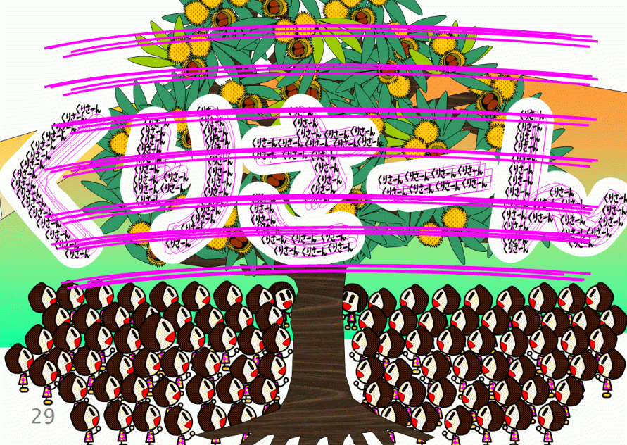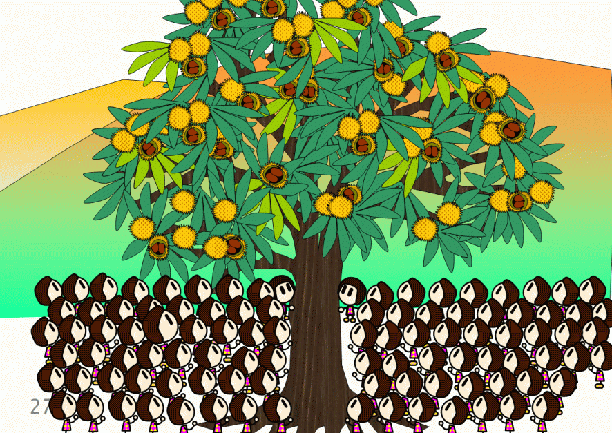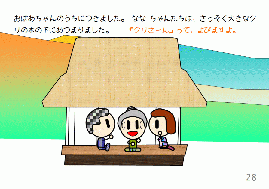 27ページおばあちゃんのうちにつきました。 なな ちゃんたちは、さっそく大きなクリの木の下にあつまりました。 「クリさーん」って、よびますよ。