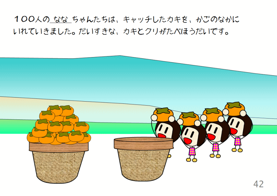 100人の なな ちゃんたちは、キャッチしたカキを、かごのなかに