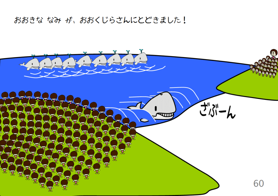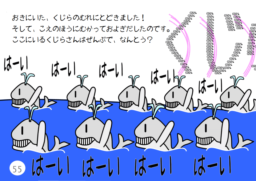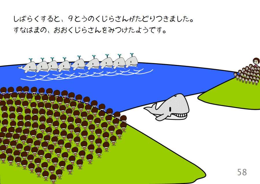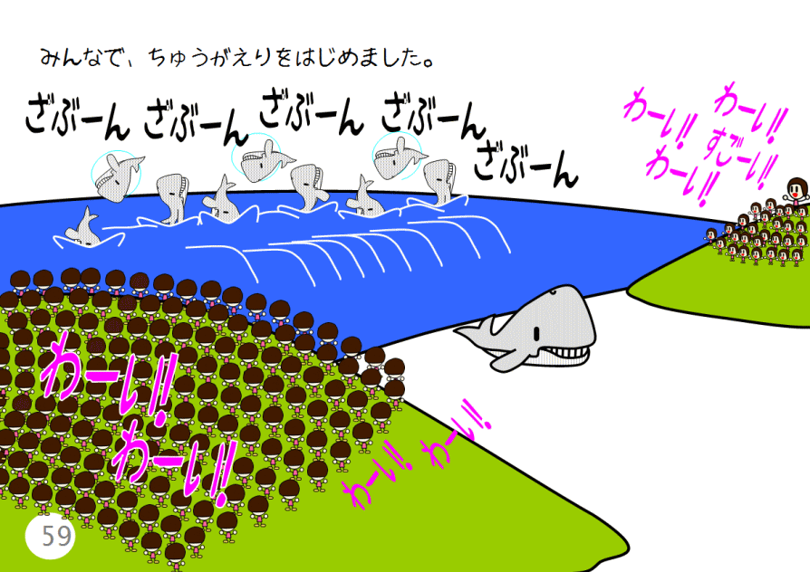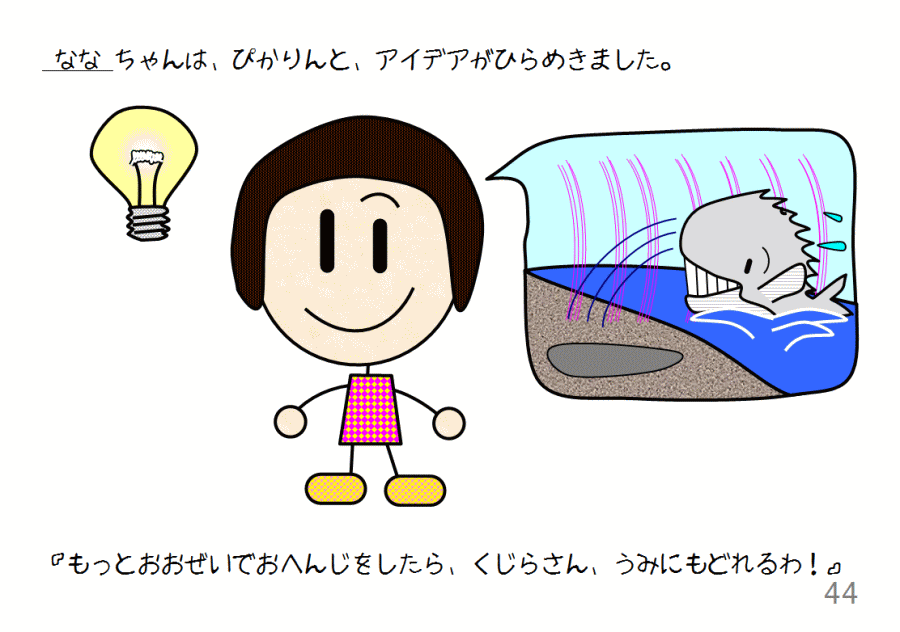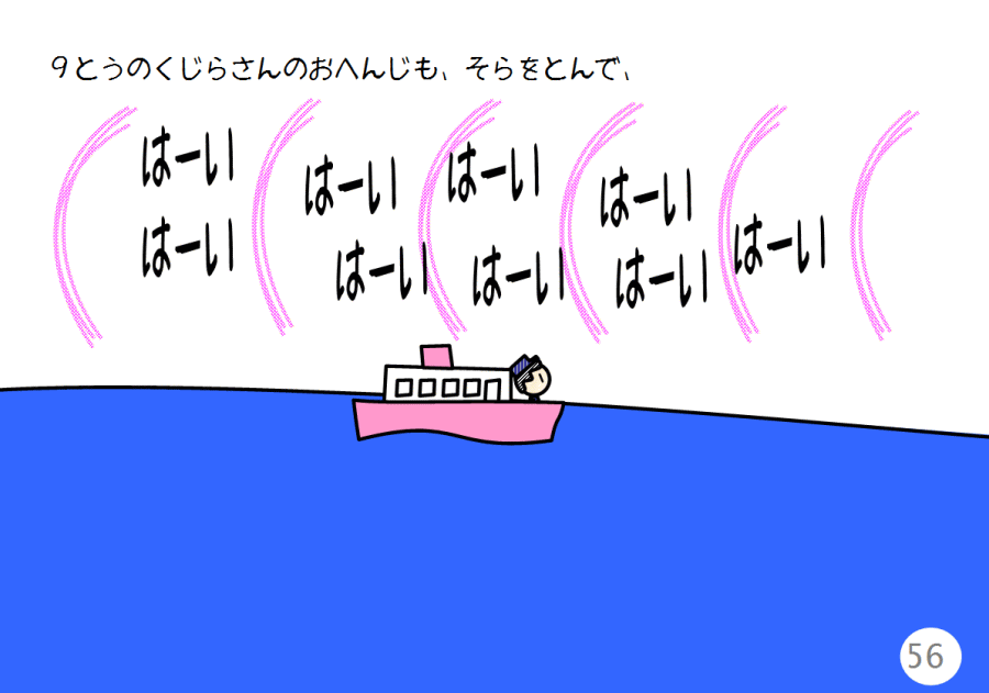 『もっとおおぜいでおへんじをしたら、くじらさん、うみにもどれるわ!』