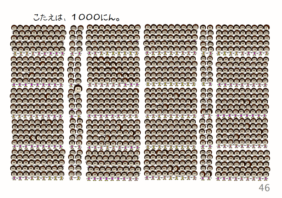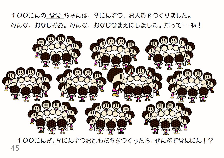 100にんの なな ちゃんは、9にんずつ、お人形をつくりました。