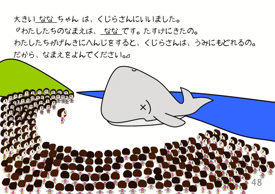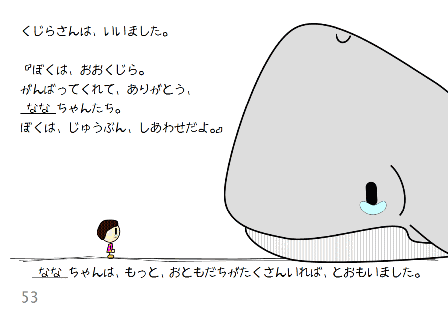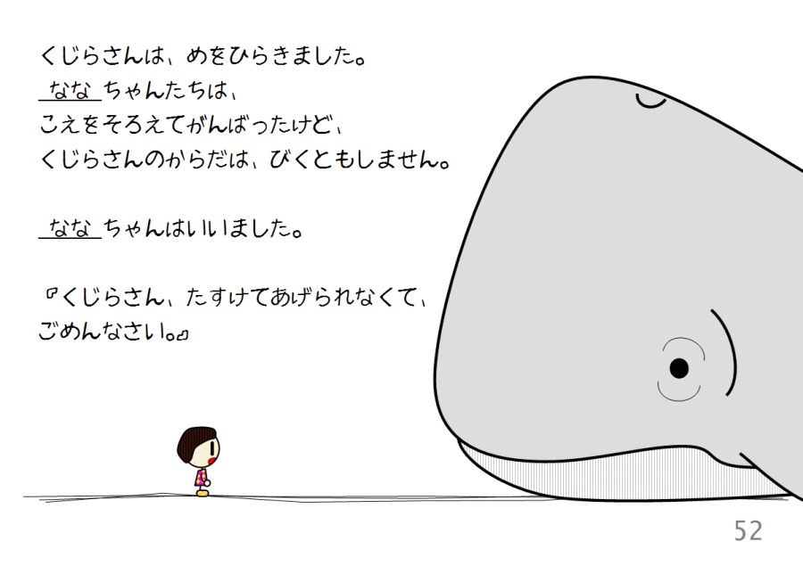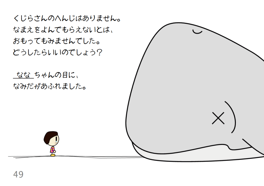 『わたしたちのなまえは、 なな です。たすけにきたの。わたしたちがげんきにへんじをすると、くじらさんは、うみにもどれるの。だから、なまえをよんでください。』