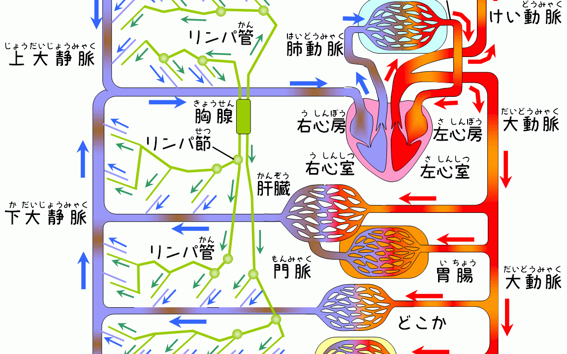 「リンパ腺」「リンパ管」「リンパ球」など「リンパなんとか」というのがありますが、いまもナゾの多いものなのだそうです。リンパ管と血管とのつながりをだいたいまとめてみました。