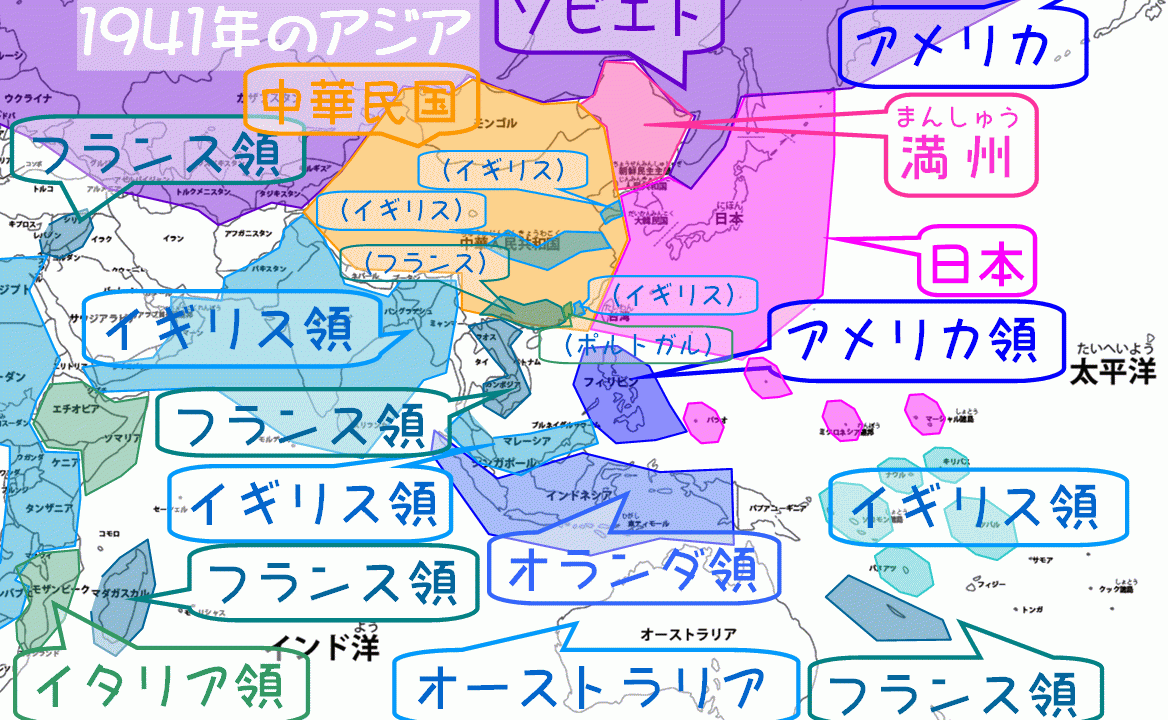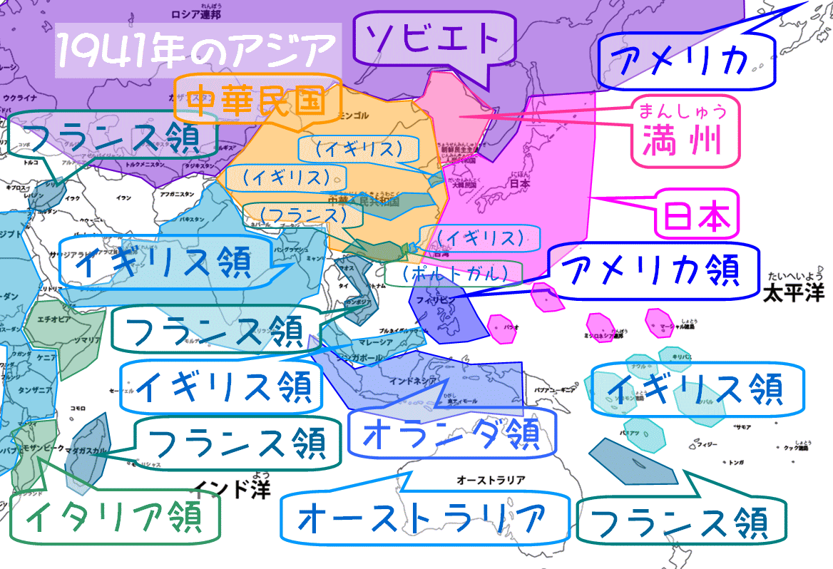 日本が開戦した1941年当時、アジア諸国はこのような勢力図でした。日本はアジアの中で唯一独立を保ち、民主化が浸透している国でした。